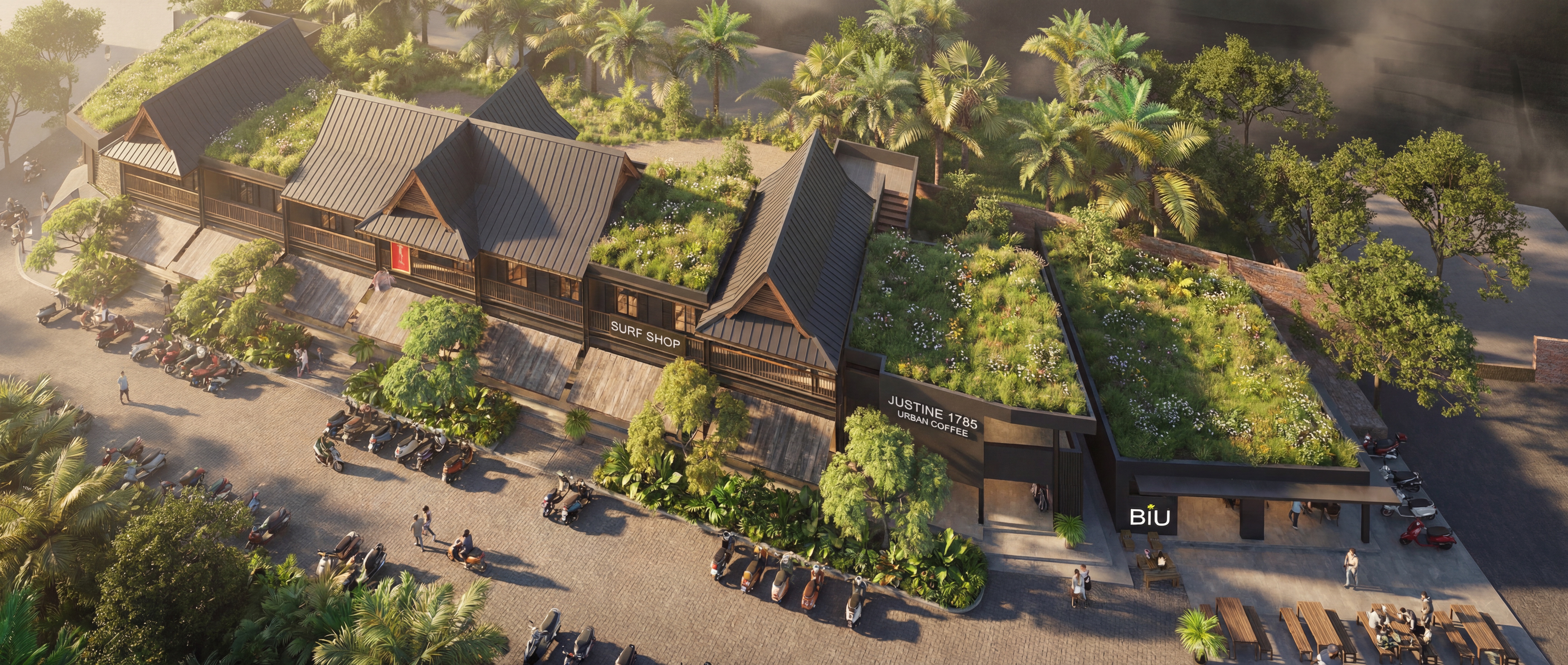 Dark volcanic stone, tropical hardwoods, water features, and abundant greenery create a retail environment that feels indigenous yet refined.